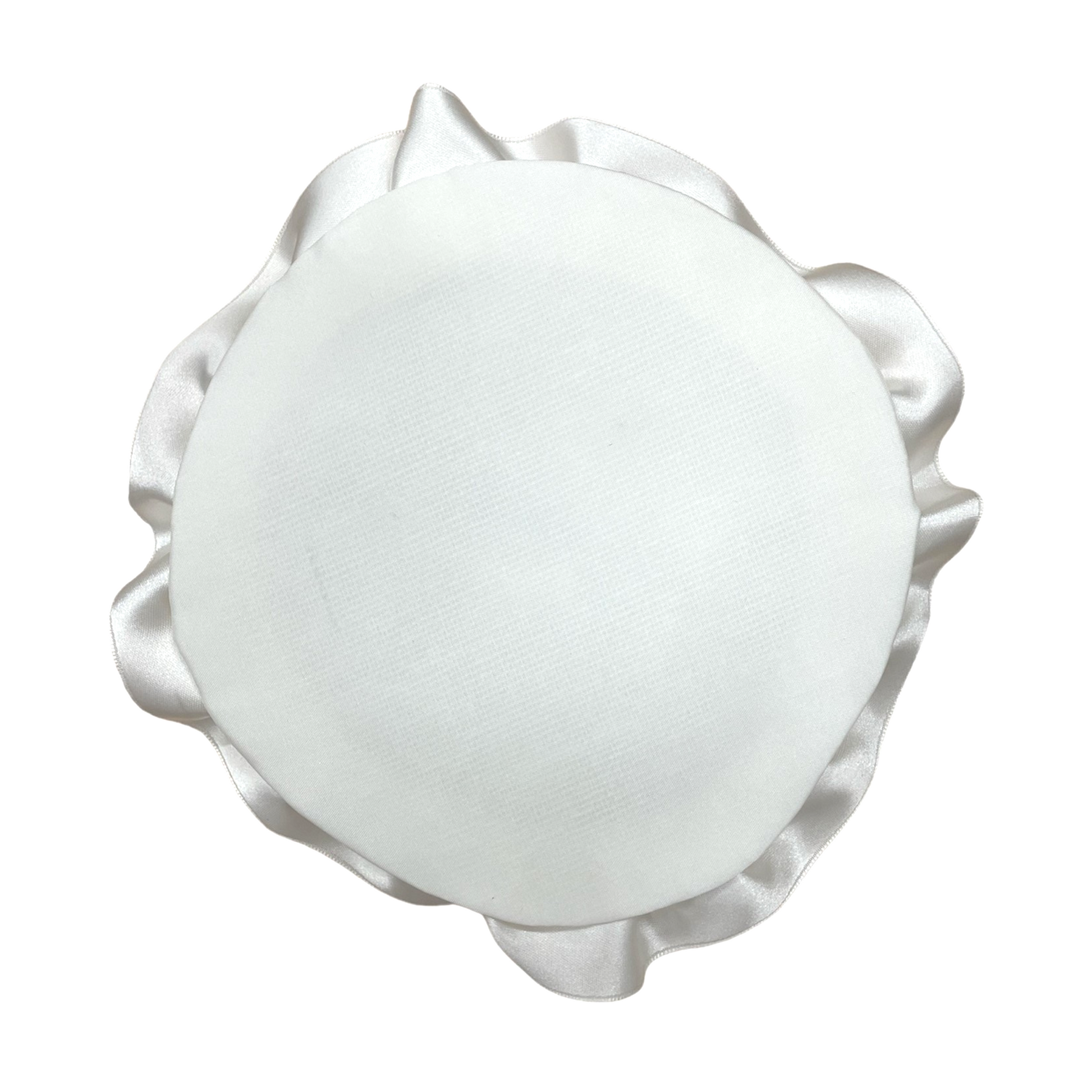 Il portafede Avigliana ha una forma circolare a fiore ed è mostrato nella sua variante in base raso, con petali organza, swarovski e perline e presenta le seguenti misure: