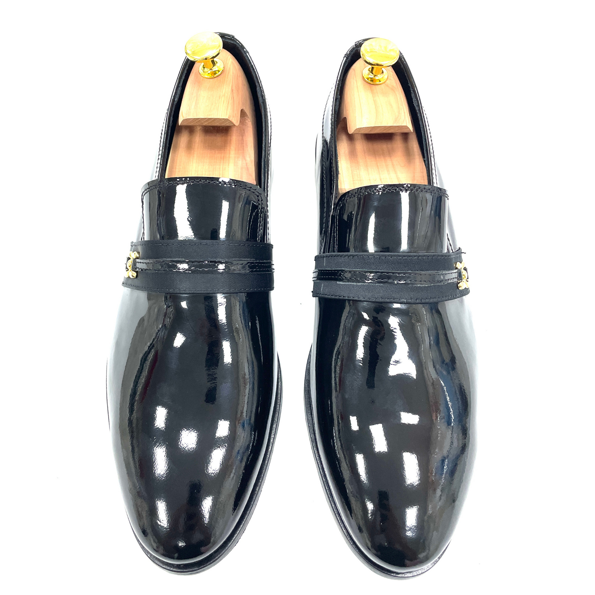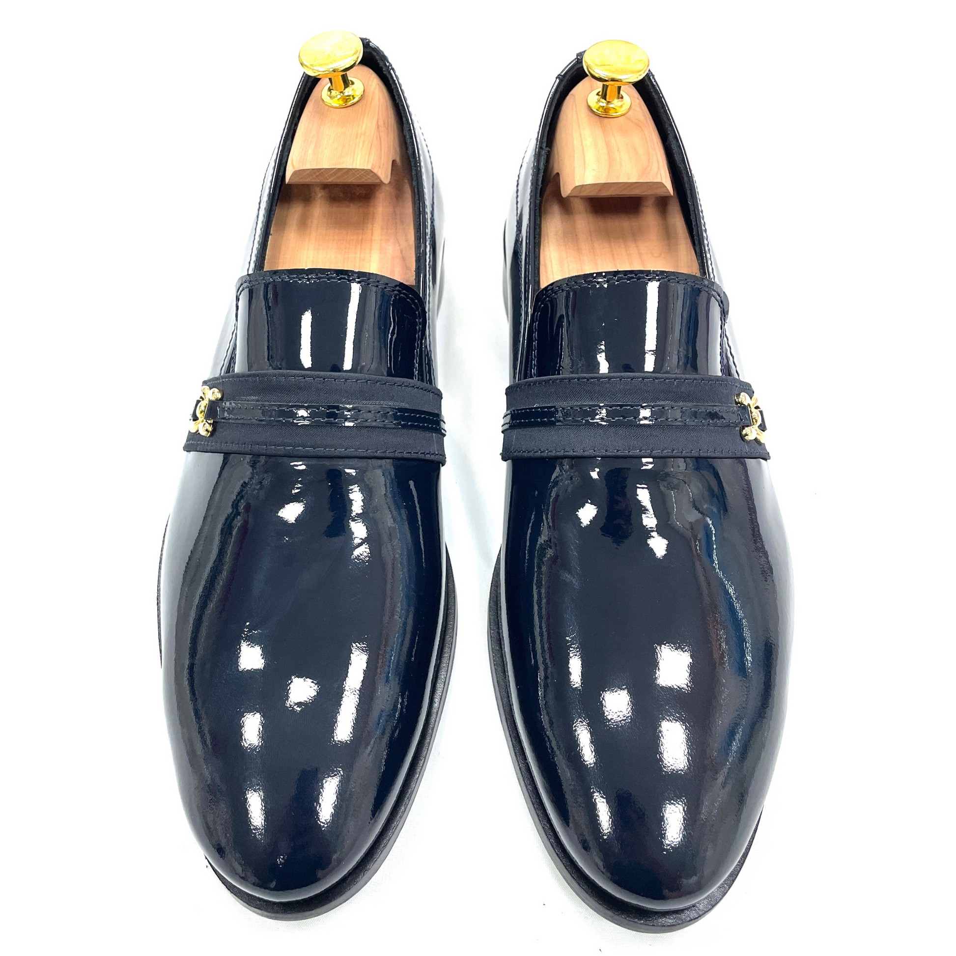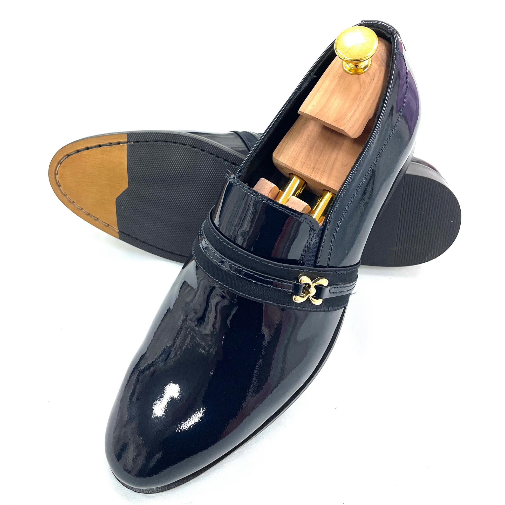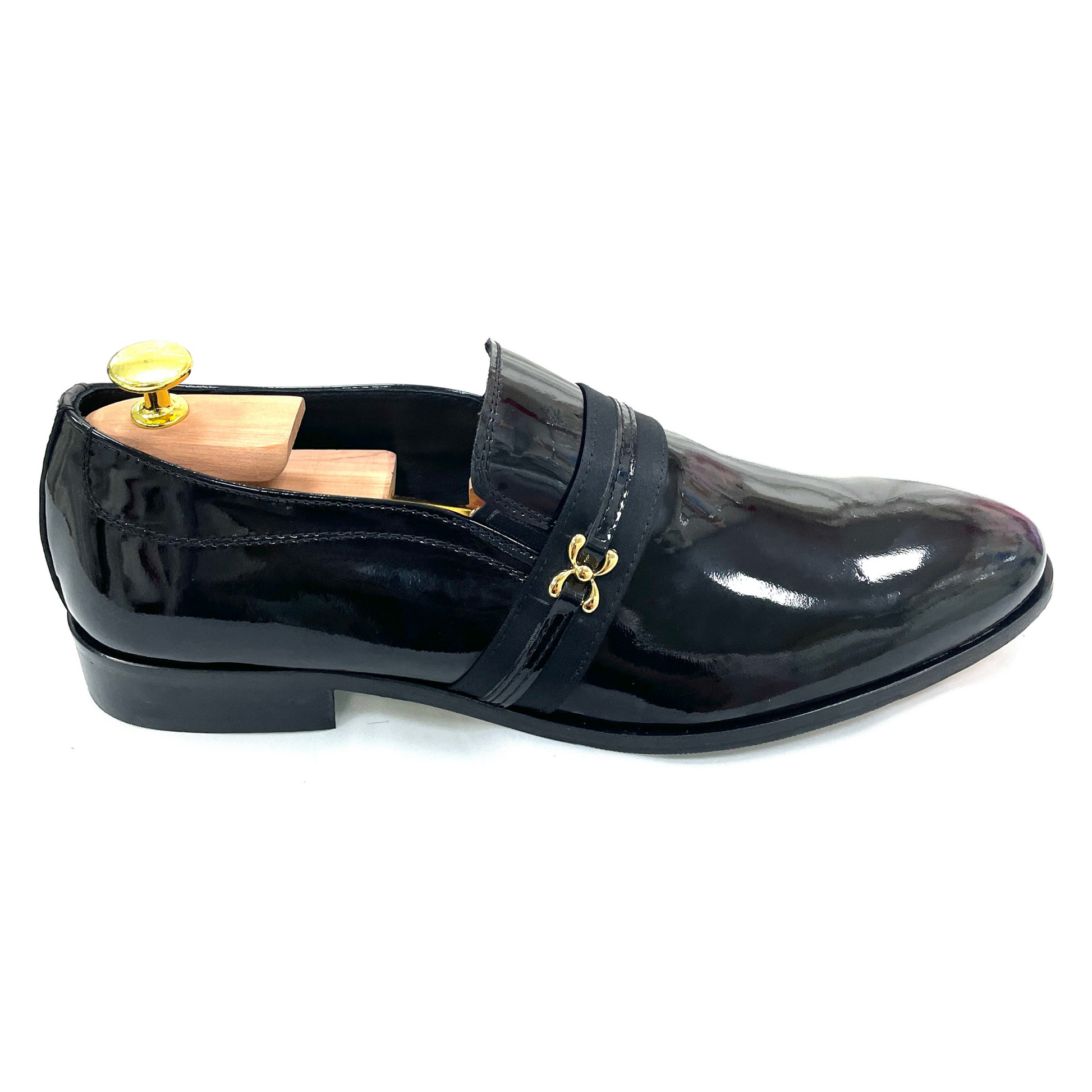 La tomaia in vernice nera conferisce un’eleganza lucente e senza tempo, mentre l’applicazione dorata aggiunge un tocco di esclusività, valorizzando la silhouette del mocassino. Ogni dettaglio è studiato per esprimere un equilibrio armonioso tra tradizione sartoriale e contemporaneità. Il risultato è una calzatura che non passa inosservata, ma che mantiene sempre un’eleganza sobria e raffinata.
