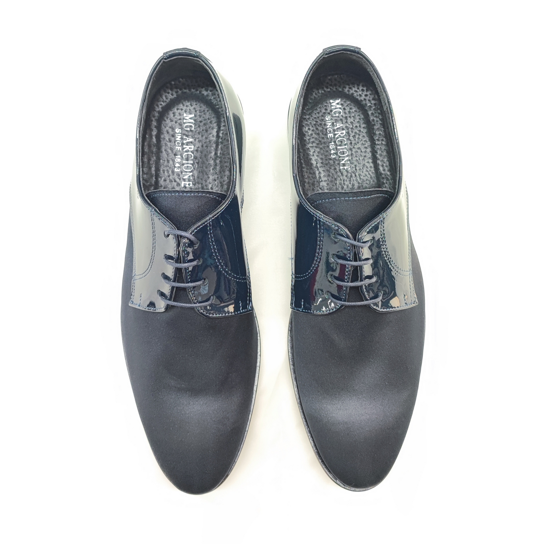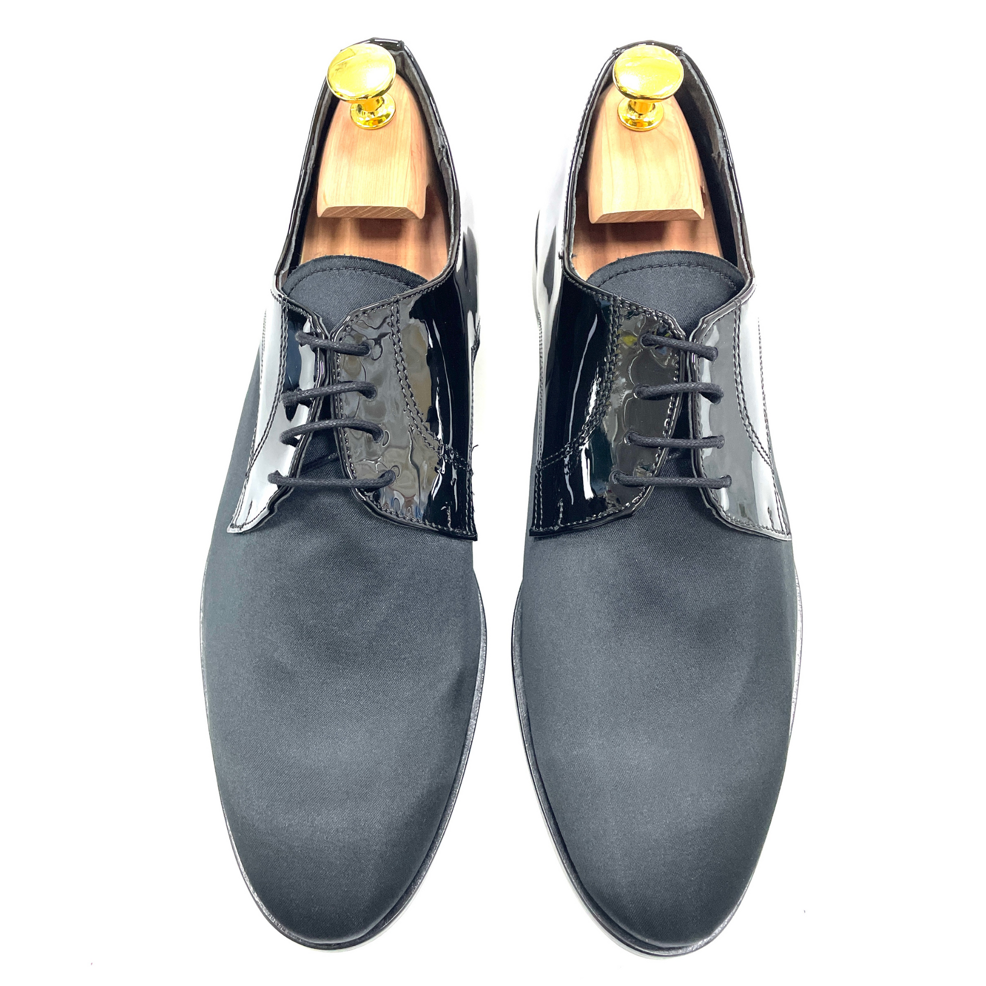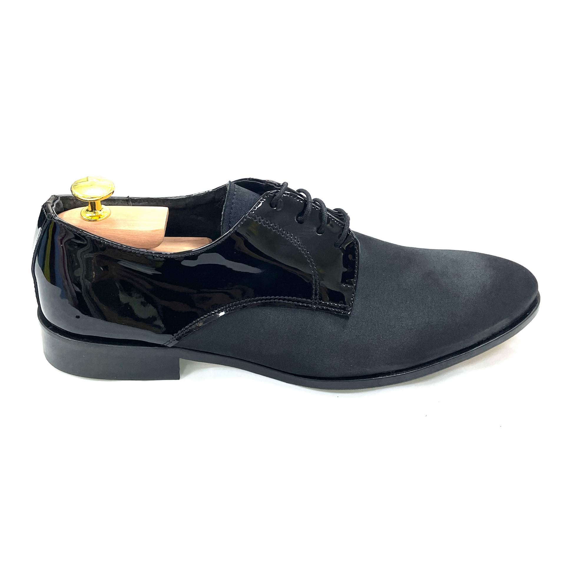 Interamente lavorata a mano con tanta dedizione, la calzatura presenta un assemblaggio in tessuto raso nero, in contrasto con la parte in vernice nero, come si può ammirare dalle foto e dal video.