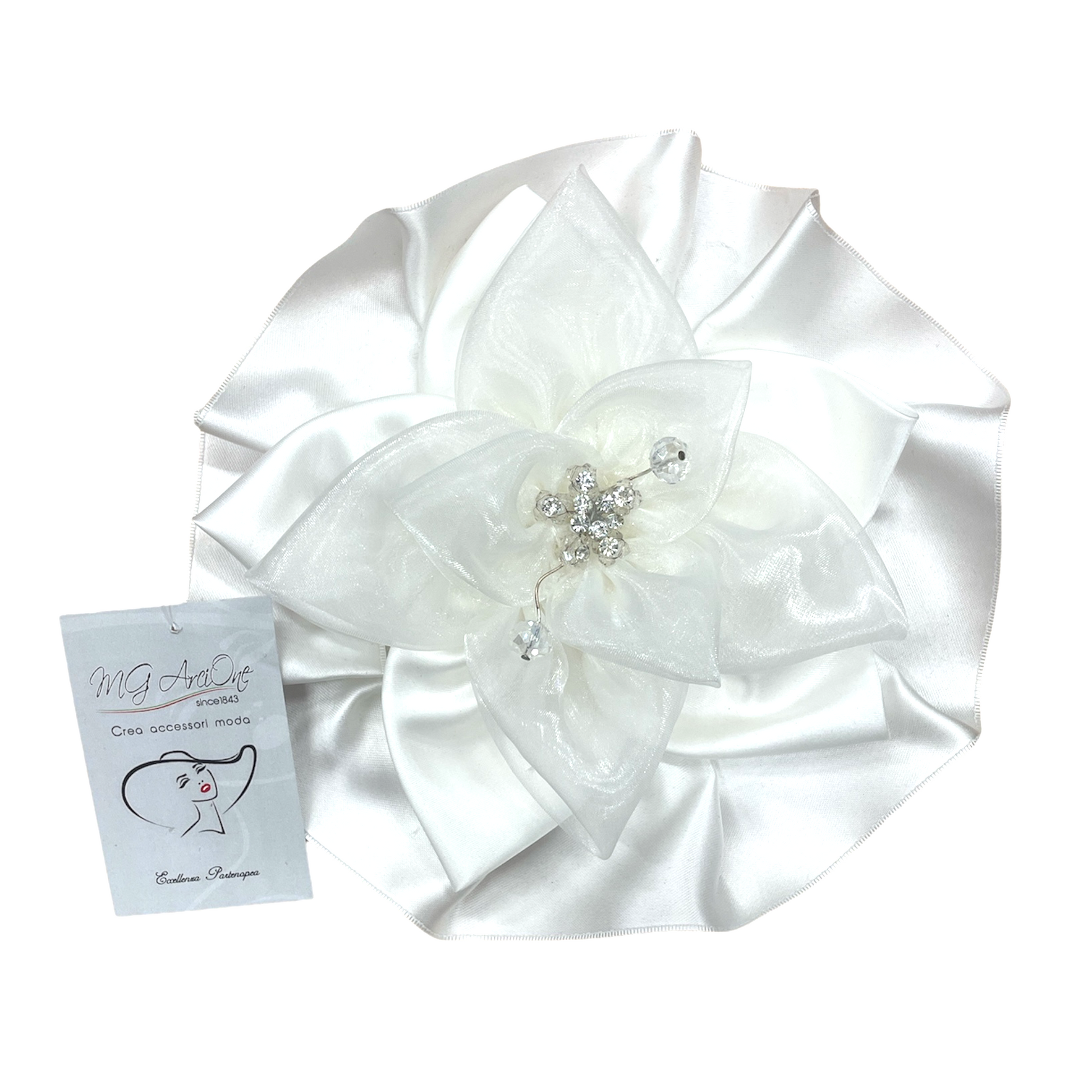 Ventina Base Raso con Petali in Raso e Organza, Swarovski e Strass